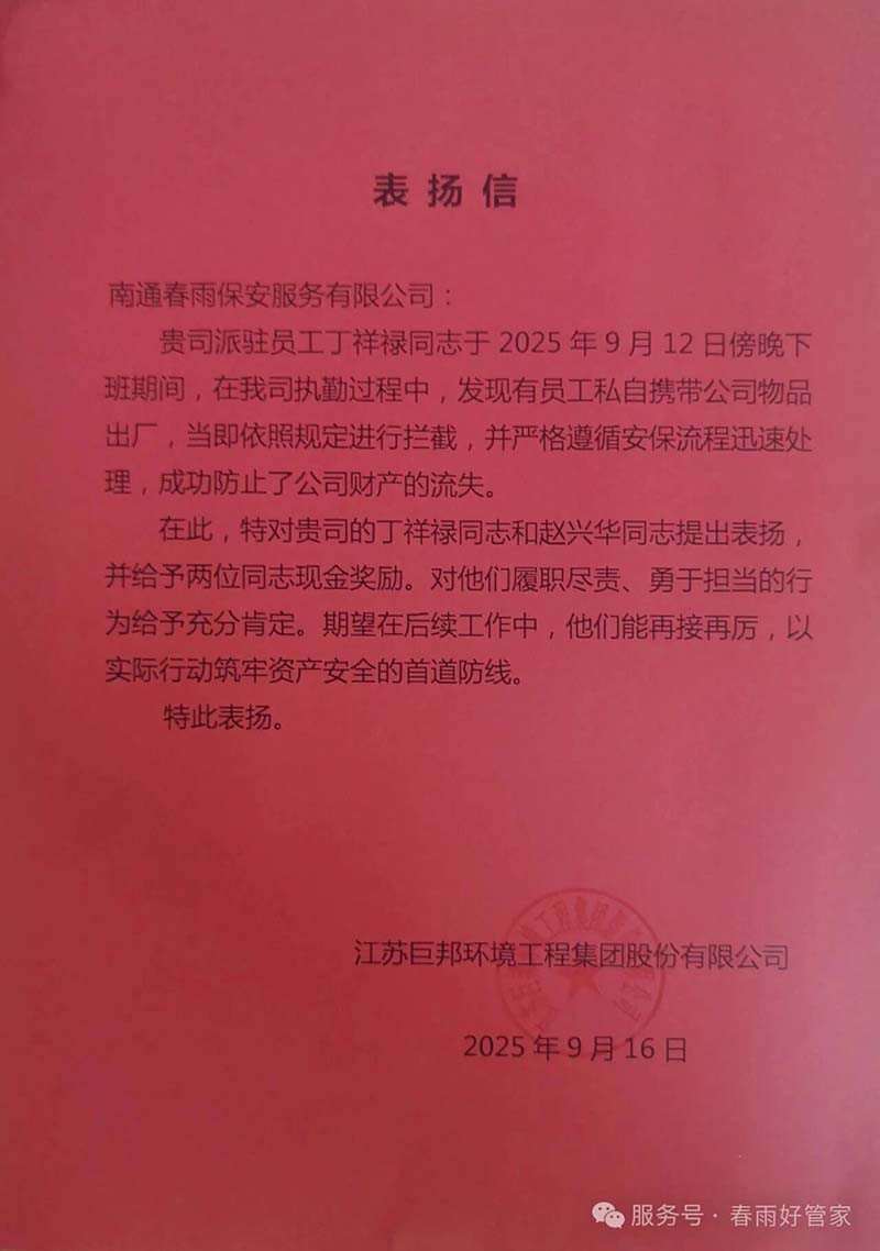 近日,我司收到了来自客户单位“江苏巨邦环境工程集团股份有限公司”的表扬信,对驻场保安员丁祥禄同志和赵兴华同志的尽职表现和专业精神提出高度赞扬。